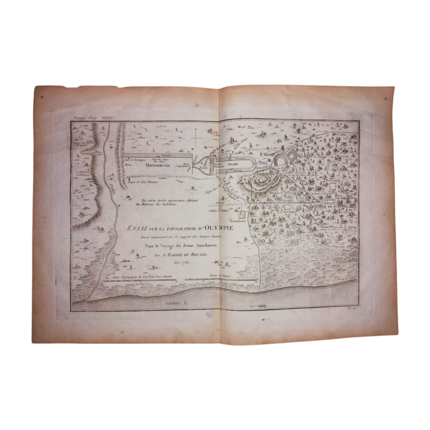 Χαλκόγραφος χάρτης της τοπογραφίας της Ολυμπίας στον οποίο απεικονίζονται ο Ιππόδρομος, το Στάδιο και οι αρχαίοι Ναοί.