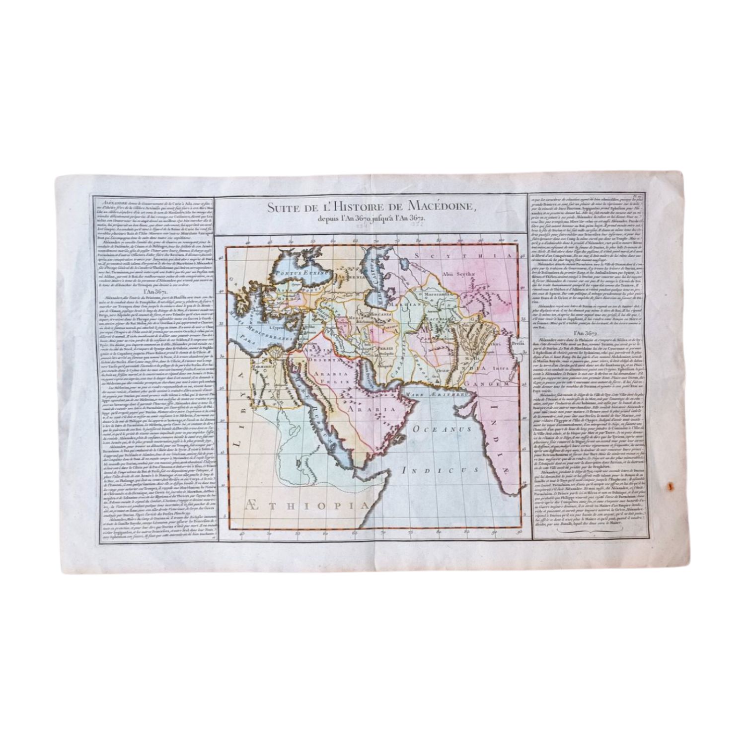 Στις δύο πλευρές του χάρτη, δεξιά και αριστερά, περιλαμβάνεται σημείωμα με ιστορική αναφορά στην πορεία του Μεγάλου Αλεξάνδρου κατά τα αναφερόμενα ετη.